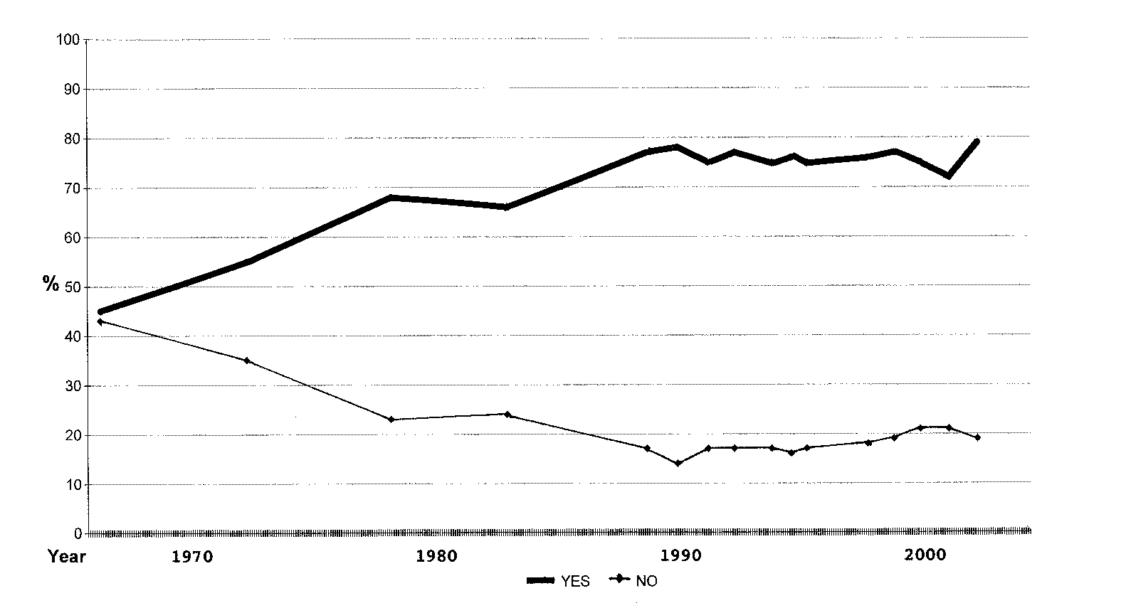 The precise dates and percentages are as follows: (First date shown is date of data collection; parenthesized date is date of publication) Yes No Aug. 1968 (Aug. 1968) 45 43 Mar. 1974 (May 1974) 55 35 Sep. 1979 (Oct. 1979) 68 23 Feb. 1984 (Apr. 1984) 66 24 Jun. 1989 (Jul. 1989) 77 17 Aug. 1990 (Aug. 1990) 78 14 Oct. 1991 (Nov. 1991) 75 17 Oct. 1992 (Nov. 1992) 77 17 Mar. 1994 (Apr. 1994?) 75 17 Dec. 1994 (Jan. 1995) 76 16 Jul. 1995 (Aug. 1995) 75 17 Nov. 1997 (Mar. 1998) 76 18 Nov. 1998 (Dec. 1998) 77 19 Nov. 1999 (Dec. 1999) 75 21 Dec. 2000 (Jan. 2001) 72 21 Jan. 2002 (Feb. 2002) 79 19 |
